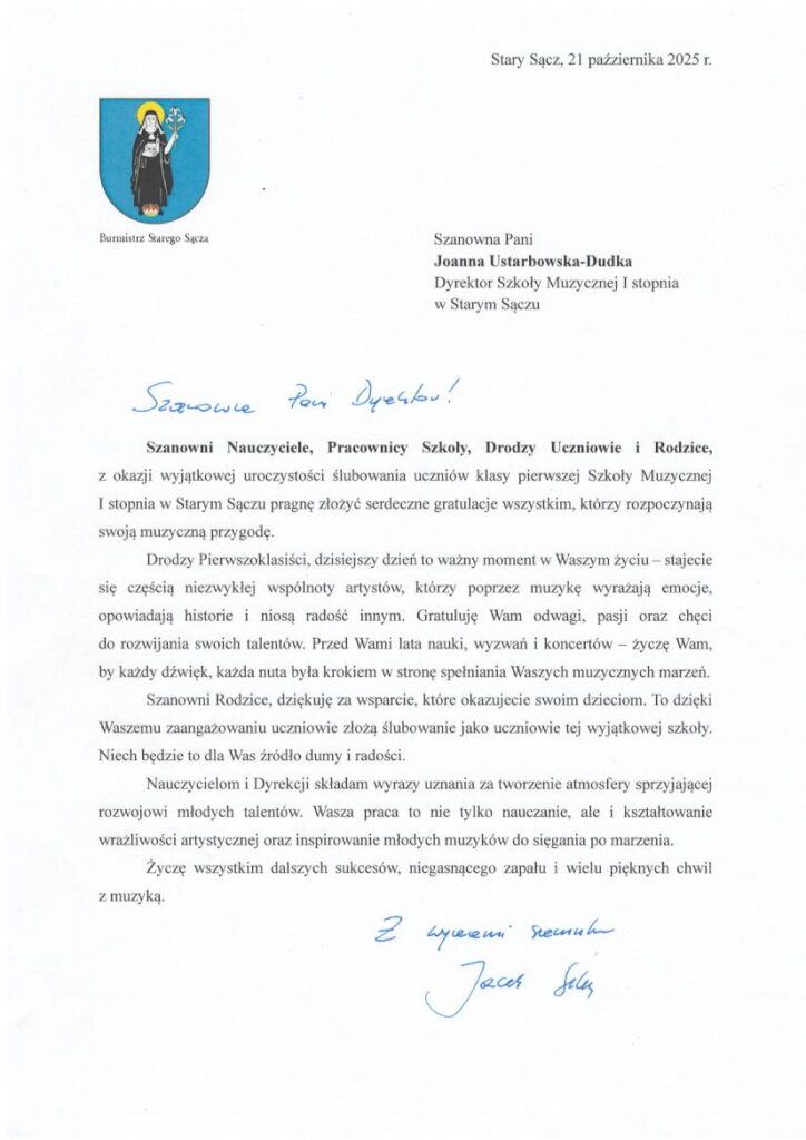 Na ręce pani dyrektor wpłynął list Burmistrza Starego Sącza, Jacka Lelka, wyrażając słowa uznania dla całej społeczności szkolnej, a szczególnie dla najmłodszych uczniów rozpoczynających swoją muzyczną drogę. Burmistrz podkreślił, jak ważną rolę pełni szkoła w życiu kulturalnym miasta oraz jak wiele wnosi w rozwój artystyczny młodego pokolenia starosądeczan.