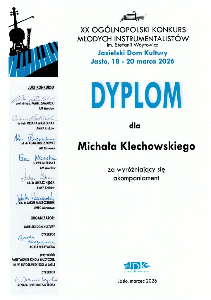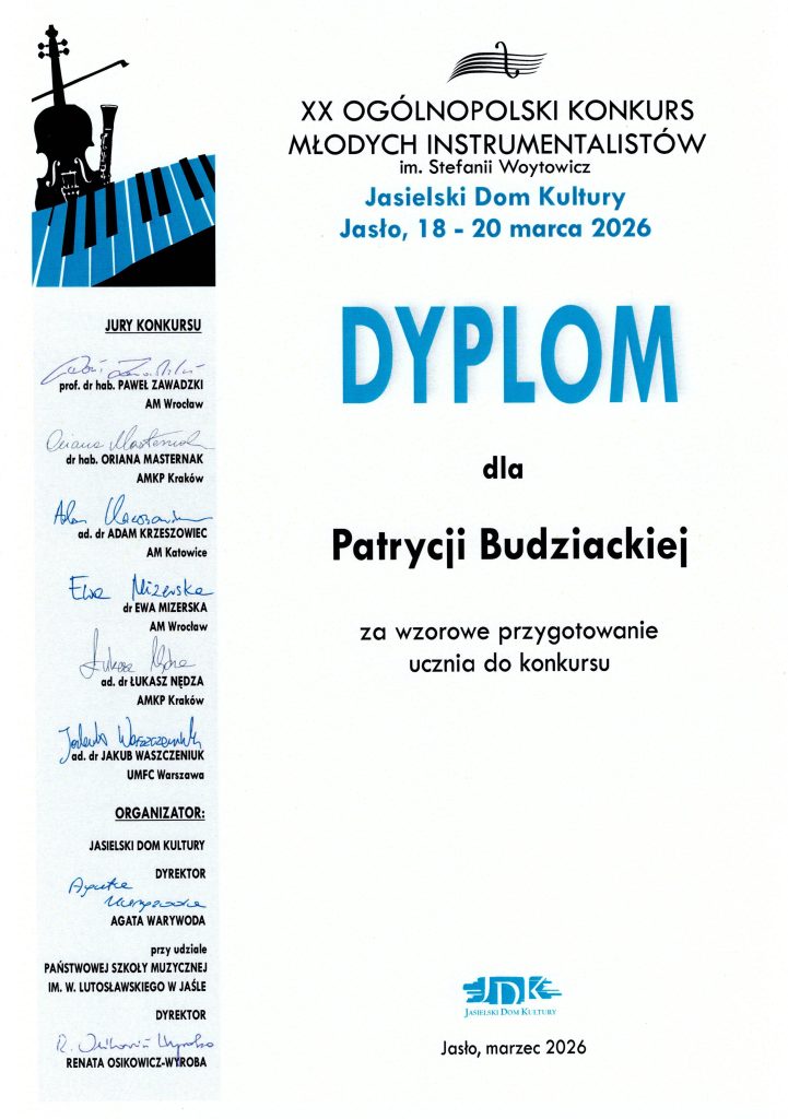 Podczas XX Ogólnopolskiego Konkursu Młodych Instrumentalistów im. Stefanii Woytowicz w Jaśle nasza uczennica Hania Stawiarska zdobyła III miejsce. Pan Michał Klechowski otrzymał dyplom za wyróżniający się akompaniament, a pani Patrycja Budziacka dyplom za wzorowe przygotowanie uczennicy. Gratulujemy!